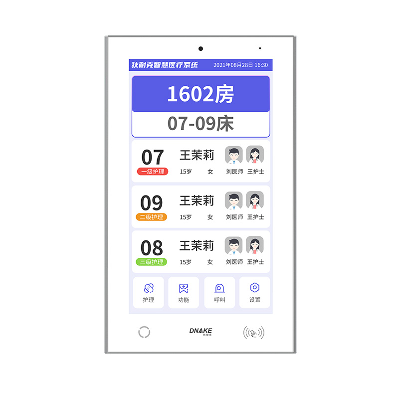 設置在病房門口的終端設備,主要用于顯示病房相關信息,內置簡易醫(yī)護工作站,支持病房床位一覽、患者動態(tài)跟蹤、呼叫對講、增援求救等多種呼叫類型,信息齊全,及時響應醫(yī)護需求,實現智能化醫(yī)護管理。